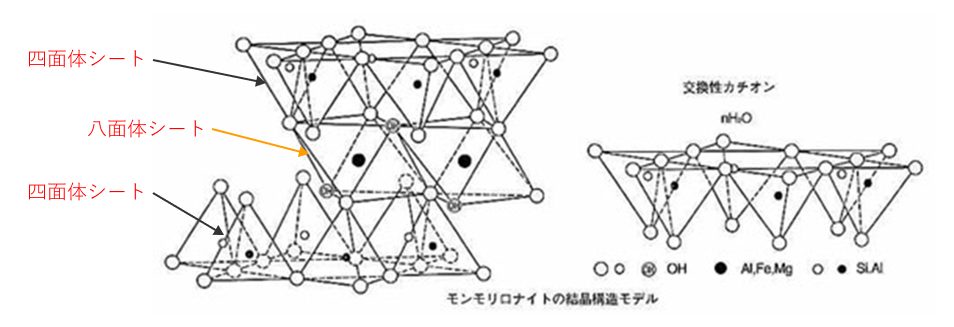 図-1 2:1型の粘土鉱物の結晶構造モデル((株)ホージュン資料に加筆)