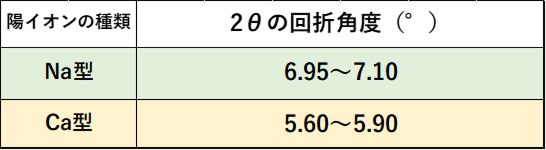 その話は、X線回折分析の定方位法によって、どのタイプのモンモリロナイトが含まれているかの同定ができるようよ。例えば、神山裕幸ら(★2)によれば、新第三紀中新世の砂岩・泥岩のスレーキング特性と含有するスメクタイト(モンモリロナイト)の交換性陽イオン組成との関連性を調べていて、その中で、X線回折分析により、表-1に示すようにNa型、Ca型の分類も行っています。だから、区別ができるのよ、蒲田さん!!