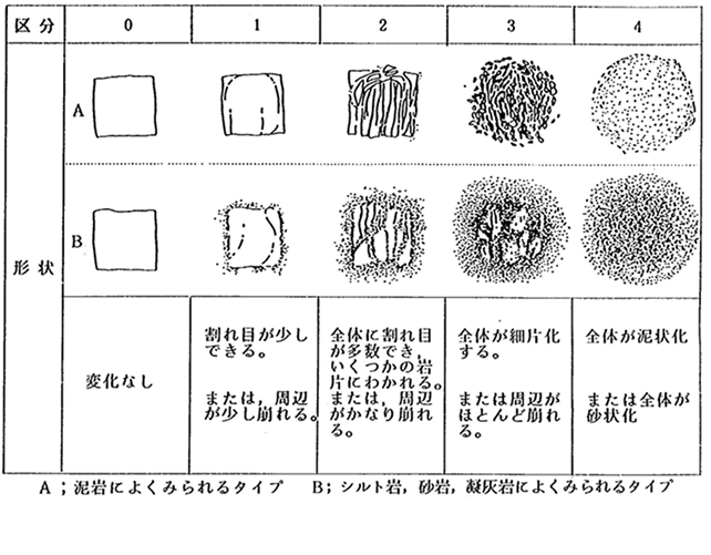 ❸試験手順:試験の手順は、図-2にまとめています。この中で、乾燥は1週間~10日間程度風乾する、または、1~2日風乾した後、40℃で2日程度炉乾燥することになっています。試験時の供試体の観察は、「初期観察」と「スレーキング観察」との2種類がありますが、「初期観察」では、供試体の「形状・色調・粒度・層理・葉理など」について記載します。一方、「スレーキング観察」の項目に関しては、水浸(清水)によって生じる形状変化を1 , 2 , 4及び24時間ごとに観察し、形状が図-3のどの区分に相当するかの判定が必要です。