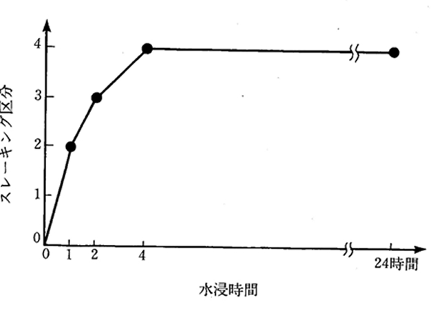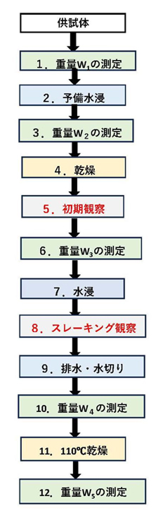 ❷試験方法:浸水崩壊度試験は、試験片を清水中に浸水させたときの状態変化を浸水後30分、1、2、4、6、24時間経過ごとに観察し、記録します。