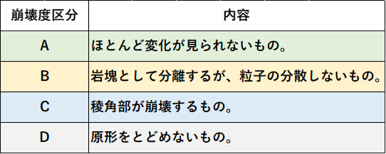 c )各測定時間における試験片の状態をA~Dの記号で示します。なお、浸水24時間後における試験片の状態を写真撮影するとともに、特徴をスケッチします。なお、崩壊度区分は、表-2に示す通りです。