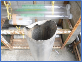 一般に、チューブの刃先はサンプリング時に硬い土質や砂、礫、人工物に当たって変形してしまうことが多いとされています。当組合では、搬入時確認(業務部)と押出し前確認(技術部)の2回、目視確認により「押出しに影響がある変形」を発見、特定します。