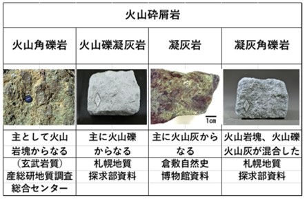 一方、火山の爆発的な噴火によって固結したマグマが粉砕され、周囲に散乱して堆積したものは、火山砕屑岩と呼ばれて、堆積岩に分類されています。さらに、火山砕屑岩類は、含まれる岩片の種類によって分類されます。表-4 には、代表的な火山砕屑岩類の写真をまとめていますので、参考にしてください。
