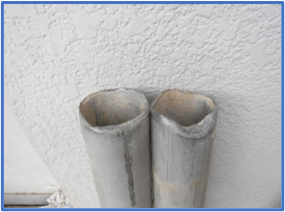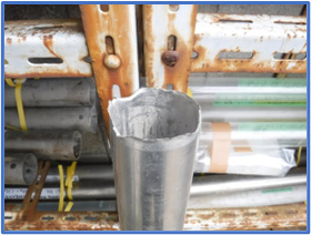 上記(写真-2)のように、変形の仕方は原因によって様々ですが、刃先がチューブの内側に向かって曲がっているものは、それ自体が押出しの際に土を抉ってしまいますので、特に注意を要します。また、変形が大きいものはシンウォールチューブ自体にも変形をきたしているケースが多くあります。目視や触診でわかるものは変形部全体を、そうでない場合も先端ギリギリではなく多少の余裕をもって切断するようにしています(写真-3)。