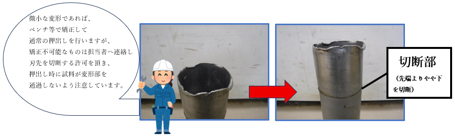 一般に、チューブの刃先はサンプリング時に硬い土質や砂、礫、人工物に当たって変形してしまうことが多いとされています。当組合では、搬入時確認(業務部)と押出し前確認(技術部)の2回、目視確認により「押出しに影響がある変形」を発見、特定します。